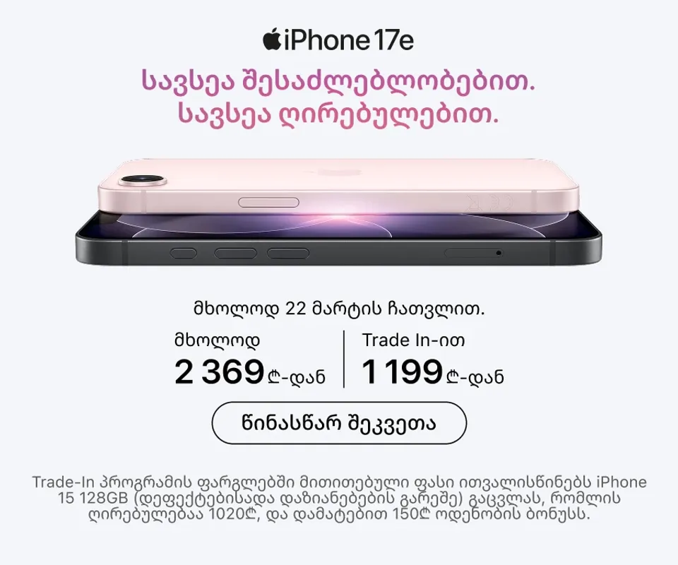 - გადახდის მოქნილი პირობები – შეგიძლიათ გადაიხადოთ სრული თანხა ერთიანად, ისარგებლოთ Trade In-ით ან შეიძინოთ განვადებით;